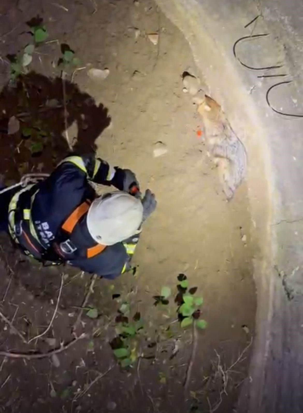 Yapılan incelemeler neticesinde, kuyunun içinde bir çakalın mahsur kaldığı tespit edildi. Olay yerine sevk edilen itfaiye ekipleri, sarkıttıkları bir merdiven yardımıyla kuyuya indi. Çakal, ekipler tarafından iğne ile uyuşturularak kontrollü bir şekilde düştüğü yerden çıkarıldı.